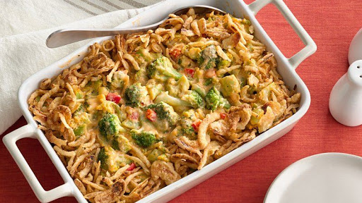 Bake uncovered 20 to 25 minutes or until vegetables are tender. Sprinkle reserved onions around outer edge of casserole; bake 5 minutes longer.