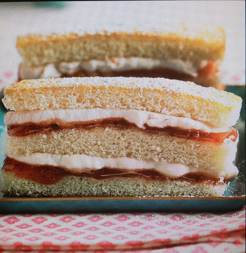 Split cakes horizontally into 3 layers, (to cut sponge cake into layers with ease, cover the cake with plastic wrap and freeze 2 hours before sliing) for each cake spread a thin layer of jelly on the bottom, top with 1 Tbsp. whipped cream mixture, place 2nd cake layer and repeat jelly and whip cream, top with final layer. Sprinkle with powdered sugar.