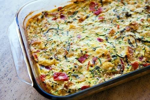 3 Coat the bottom and sides of a 9x13 baking dish generously with olive oil. Pour the egg vegetable mixture into the baking pan and even it out in the pan. Place in the middle rack of the oven. Bake for 30 minutes at 350°F. The casserole should puff up and brown lightly. If it hasn't after 30 minutes at 350, increase the heat to 425° and cook for 5-10 minutes further. Remove from oven and let cool on a rack for 10 minutes before cutting into squares to serve.