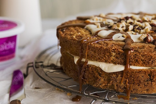 Place your bottom layer on your cake plate and spread ⅔ of your crème fraîche mixture on the bottom layer. Drizzle a bit of the caramel on top of the filling and place the top layer on top. Spread the rest of your crème fraîche on top of the cake. Sprinkle with chopped hazelnuts and drizzle your caramel all over the top of the cake.