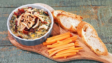 Add all the ingredients from the skillet to the cheese mixture and stir until evenly mixed. Mix the bacon and fried onion crumbles. Place dip in serving bowl and top with the bacon and fried onion mixture.