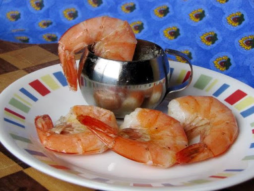 Preheat oven to 400 degrees. In a shallow roasting pan or cookie sheet, spread shrimp into a single layer. Drizzle olive oil over the shrimp, sprinkle with salt and pepper. Toss shrimp to coat evenly. Bake for 10-12 minutes or until shrimp is pink, curled and cooked through. Meanwhile, heat butter and smashed garlic clove in a small saucepan over low heat, stirring occasionally. Remove garlic clove and serve the melted butter with shrimp. It’s that easy!