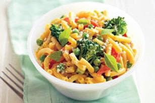 Cook macaroni per package instructions, adding fresh vegetables and olives to the boiling water for the last 3 minutes; drain.