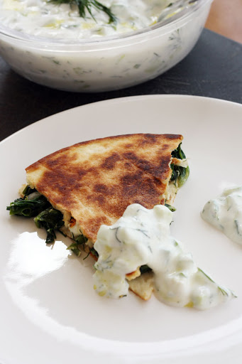 Slice each round into six quesadillas and serve with the tsatziki sauce immediately.
