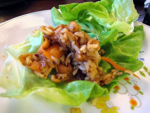 In the hot pan/wok, add the remaining Tablespoon of oil, the diced chicken, shredded carrots, peanuts, chopped onion, minced garlic, rice, and stir in the sauce. Saute for a couple of minutes and then serve in the lettuce leaves