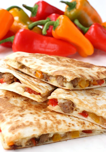 In the same skillet, add one flour tortilla over medium heat and layer on one cup of the sausage filling topped with a cup of cheese. Top with another tortilla and press down with a plate.