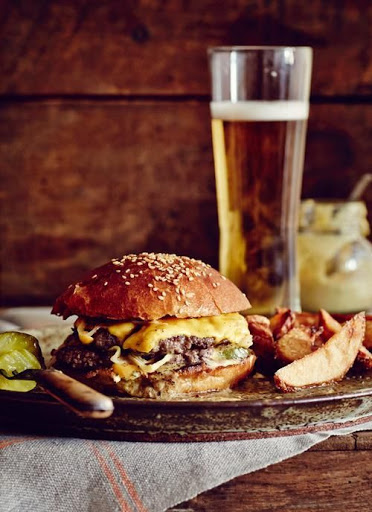 4. Heat two 12-inch cast-iron skillets until as hot as possible. Divide the patties between the two hot pans. When the patties are nice and charred, about 2 minutes, flip them over and cook for 2 minutes more for medium. Place the onion slices on 10 of the patties. Place a slice of the cheese on all of the patties and allow it to melt, about 30 seconds. Stack the non-onion patties on top of the onion patties. Remove from the heat.