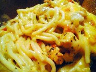 What's for dinner!? Try this easy to prepare Spaghetti with chicken, mushrooms and tomatoes in a creamy cheese sauce, you'll be happy you did!