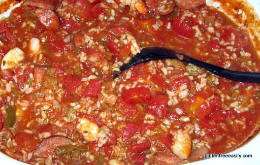 Jambalaya with sausage, rice, peppers, onions, tomatoes and rice with Cajun seasoning. Served great with cornbread.