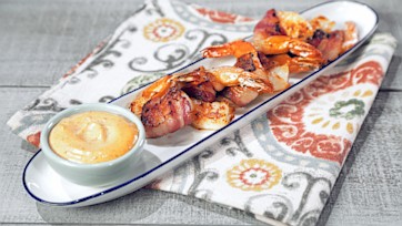 Place a skillet over medium-high heat and add oil. Add the shrimp, seam side down. Cook until crisp. Flip shrimp and cook until bacon is crisp and the shrimp is cooked through.