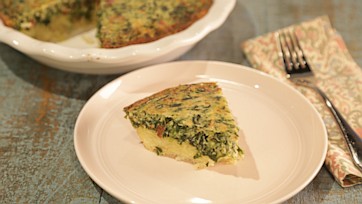 To the prepared pie dish, add the hash brown mixture. Using the back of a spoon, press into an even layer. Place in oven and bake for 15 minutes to par bake, until golden brown around the edges.