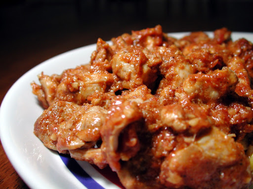 Perforate the chicken pieces with either fork tines or with little knife cuts. (The idea is to allow the marinade to penetrate the pieces somewhat and have more surface areas to cling to.) Mix well the ingredients for the marinade and rub into the chicken pieces. Let it marinate for a few hours in the refrigerator, overnight if possible for best results.