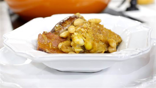In the same Dutch oven, put 1 cup of the Sofrito and deglaze with the white wine. Stir in the Beans and sachet of thyme and bay leaf. Arrange the bacon, sausages and chicken in the Dutch oven. Add the chicken stock, cover and bake in oven for 20 minutes.