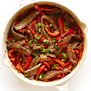 Heat a large cast-iron frying pan over medium-high heat. Season meat with salt and pepper. Add 1 tbsp. oil to skillet, then add meat and brown in 2 batches, 2 to 3 minutes per side. Transfer to a plate.2. Add remaining 1 tbsp. oil to frying pan, then add 3 thinly sliced green onions, garlic, and bell peppers