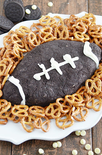 Use either a rubber spatula or your hands to coat the cream cheese filling ad form it into a ball. Once coated, transfer it to a serving platter, and shape into a football with your hands. Use excess Oreo crumbs to patch any spoyts where the cream cheese is showing through.