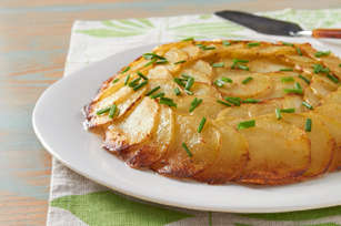 Bake 1 hour or until potatoes are tender. Loosen potatoes from side and bottom of pie plate; invert immediately onto serving plate.