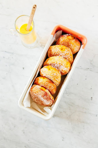To fill the donuts, use the Bismarck pastry tip (or the handle of a wooden spoon) to poke a hole into one side of each, making sure not to poke through to the other side. Fill a pastry bag with a small round tip (or a Bismarck doughnut tip, if you’re fancy) with the passionfruit curd. Insert the tip of the pastry bag into the hole and gently squeeze to fill each doughnut. Serve any excess curd on the side as a dipping sauce (it also works well with waffles!). The donuts are the best on the day they're made.