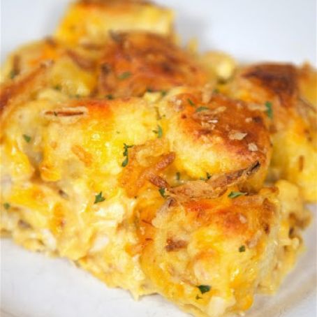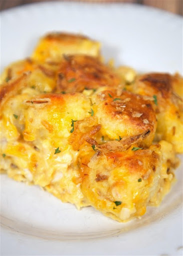 Pour chicken mixture into prepared pan. Top with French fried onions.