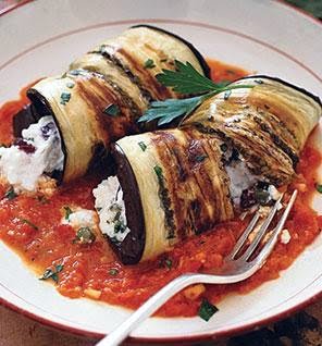 Mash cheese, olives, capers and 1 tbsp of the parsley in a bowl. Place 1 tbsp of filling at the end of each eggplant slice; roll up. Lay seam side down in dish. Bake 10 to 15 minutes. Top with remaining 1 tbsp parsley.