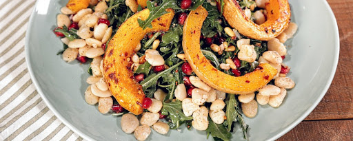 Toss the salad with the dressing, top with roasted butternut squash and beans!