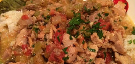 5. Add the tomatoes, chicken, stock, wine, lemon juice, vinegar and raisins and bring mixture to a boil. Reduce heat to simmer for five minutes. Add chicken and simmer for 10 or more minutes until chicken is completely cooked through. ** (if using Slow Cooker, just throw that stuff in, turn on cooker and let cook)