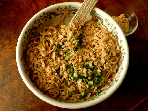 Let the pasta cool to room temperature, or refrigerate and serve cold. Top with the remaining scallions and peanuts just before serving.