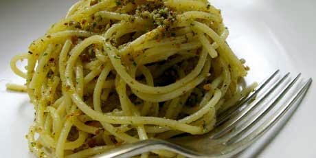 1. Put the nuts and herbs in the food processor and whiz up. The mixture will be fine, but should still have texture, not be completely pulverized. Cook the spaghetti in boiling, salted water until al dente. Drain. Toss in a bowl with the nuts (reserving some for garnish), olive oil, cheese, and zest. Serve immediately.
