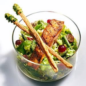 5. Divide the salad among four plates; top each plate with a salmon fillet and two bread sticks.