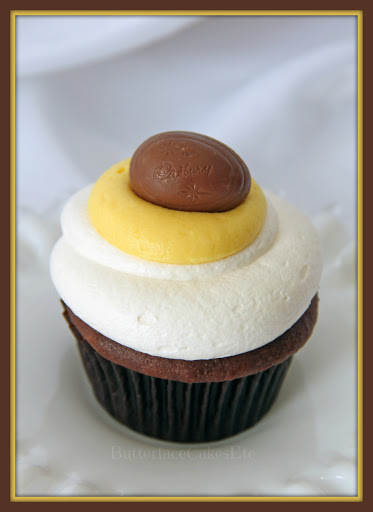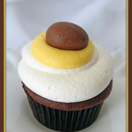Using a piping bag fitted with a #809 tip (or other round tip), pipe marshmallow frosting on cooled cupcakes. Then using the same tip, pipe a smaller circle of Nanaimo frosting in the centre of the cupcake. Place an unwrapped Easter Creme Egg on top.