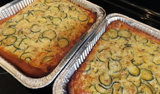 Place dough in ungreased pan. I use a 9 x 11 disposable sheet pan if I’m taking it to a covered dish affair. You can also use a 2 quart glass baking dish or an 11 inch quiche pan. Press dough over bottom and up sides to form crust. Spread crust with mustard. Pour egg/veggie mixture evenly into crust-lined pan.