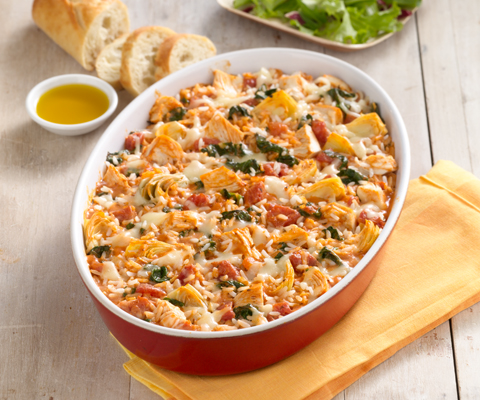 3. In a large bowl combine rice, Pasta sauce, spinach, artichokes, tomatoes, milk and chicken. Pour mixture into prepared dish.