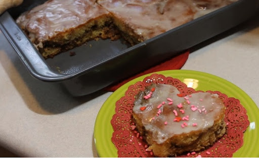 While cake is baking, mix up your glaze. Combine powdered sugar, milk and vanilla until smooth. Once cake is done, remove from oven and drizzle glaze over top.