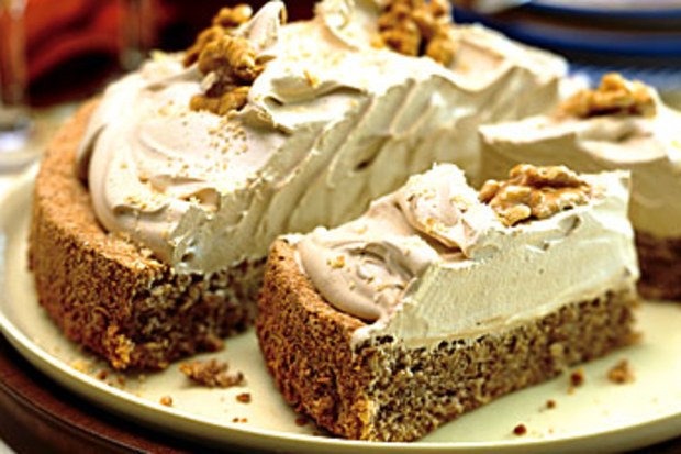 Using electric mixer, beat cream, powdered sugar, coffee mixture, and vanilla in large bowl until peaks form. Spread coffee whipped cream onto top of cake. Sprinkle top with reserved ground walnuts; arrange walnut halves in center of cake. Cut cake into wedges.