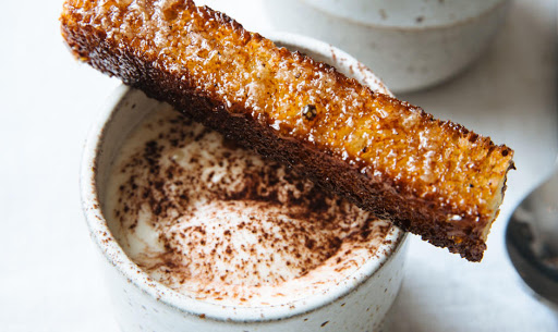 Divide mocha among mugs. Top with whipped cream and dust with cocoa powder. Serve with caramelized brioche.