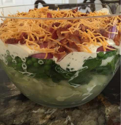In a large bowl layer the lettuce, spinach, eggs, and peas. Pat dry so there is not liquid. Add a few slices of red onion as the next layer (optional). Mix together mayonnaise, sour cream, and Hidden Valley Ranch dressing mix. Put this mixture on top of the layered salad, but DO NOT MIX THROUGH. Sprinkle crumbled bacon over the top. Cover and refrigerate overnight. Add the shredded cheese before serving.