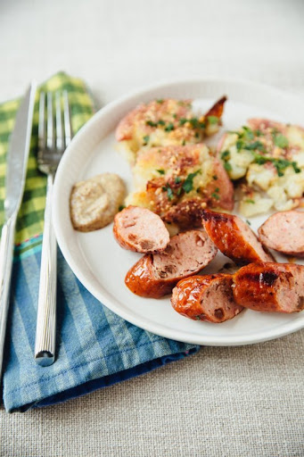 Roast until the bottoms of the potatoes are browned, 15 to 20 minutes. Using the flat spatula, flip the potatoes and sprinkle with the cheese. Place the sausages on the other side of the baking sheet. Roast until the edges and tops of the potatoes are golden-brown, 15 to 20 minutes more. Sprinkle the potatoes with the parsley, if using, and serve.