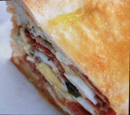 Place a layer of thin strips of mortadella, and next a layer of fromaggio fresca broken into chunks. Press down slightly if the filling is getting too high. Next, a layer of hot ham, then a final layer of proscuitto and fromaggio fresca. (An optional variation at this step is to place a single layer of baby spinach, blanched, and squeezed dry into the center ricotta layer.)