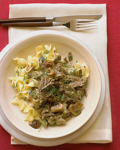 In a 2-cup glass measuring cup, whisk cornstarch with 2 tablespoons water. Ladle 1 cup cooking liquid into measuring cup; whisk to combine. Pour into a small saucepan, and bring to a boil; cook until thickened, about 1 minute. With slow cooker turned off, stir in cornstarch mixture, then sour cream and mustard. Serve beef over noodles; sprinkle with dill, if desired.