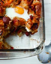 Bake the bread mixture in the center of the oven for 30 minutes. Remove the foil and bake until the top is crispy, about 15 minutes longer. Carefully remove the baking dish from the oven and, using a ladle, press 8 indentations into the bread mixture. Crack an egg into each indentation. Return the dish to the oven and bake for about 15 minutes, until the egg whites are set but the yolks are still runny. Serve the breakfast bake right away with hot sauce.