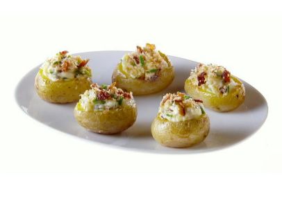When the potatoes are cool enough to handle but still warm, cut off the top third of each potato. Remove the skin from the tops. Using a 1 teaspoon measure or a melon baller, scoop out some of the insides of the cooked potatoes, leaving 1/4-inch borders around the edges. This creates little boats. Place the scooped insides and the peeled tops of the potatoes in a medium bowl and mash using a potato masher or the back of a fork. Add the reserved bacon and sour cream mixture. Using a rubber spatula, mix together the filling until well combine. Spoon the filling back into the potato boats until slightly overfilled and mounded on top. Top with a sprinkling of the panko mixture and a drizzle of olive oil. Bake until the filling is heated through and the topping is golden brown, 10 to 12 minutes. Serve warm or at room temperature.