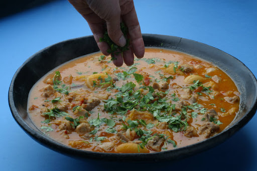 Cover and simmer until chicken is cooked through, about 30 minutes. Check cooking liquid about halfway through; if chicken is covered with liquid, remove cover for remainder of cooking. Transfer to a large bowl, sprinkle with cilantro and serve hot.