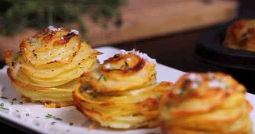 Layer the potato slices into stacks and place in the prepared muffin cups. Sprinkle some freshly ground black pepper.