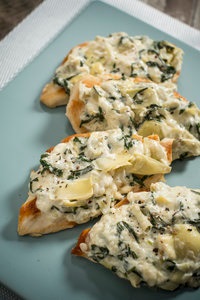 1. Place the spinach and artichoke hearts in a medium microwave-safe bowl, cover and cook on high for 1 minute. Remove from microwave and stir in ¼ cup Parmesan, mayonnaise, garlic, onion powder and black pepper. Stir in mozzarella and set aside.