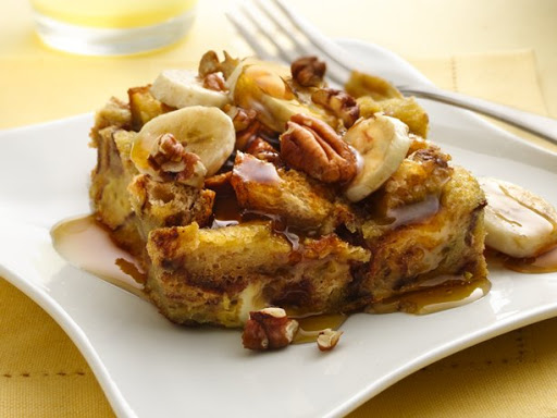 Sprinkle banana slices and pecans evenly over bread; drizzle with 1 cup of the warmed syrup mixture. Serve immediately with remaining syrup.