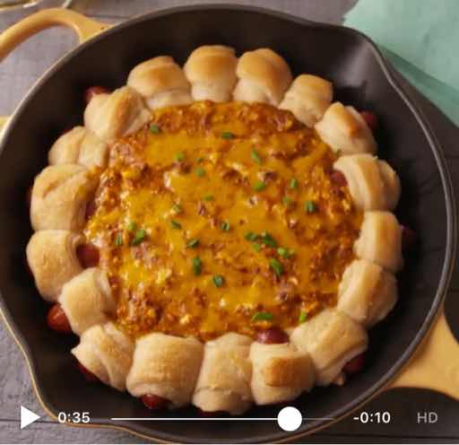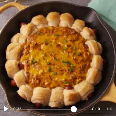 The dogs are wrapped in crescent rolls and baked with the cheeses and chili. Serve in the baking dish -- take a dog and dip!
