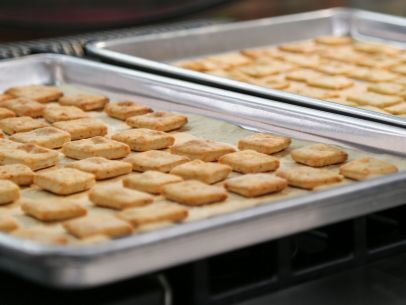 Lightly flour a work surface. Pat the dough out in into a flat rectangle, then lightly flour the dough and roll it out until it is a little less than 1/4-inch thick and about 12-by-8-inches in size. Cut the dough into squares or rectangles and carefully transfer them to the prepared baking sheet. Sprinkle with 1/4 teaspoon salt, gently pressing the salt into the surface of the crackers.