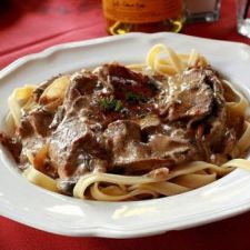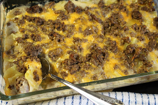 Brown ground beef with Worcestershire sauce, salt and pepper to taste. Peel and slice onions into thick slices, place into bottom of 9 x 13 inch baking dish. Peel and slice potatoes into thick slices, place them on top of the onions. Mix sour cream, mushroom soup, and ground beef together. Pour on top of the potatoes and onions. Bake 30 - 45 minutes in 350 degree oven until the potatoes are tender. Put cheese on top and let melt.