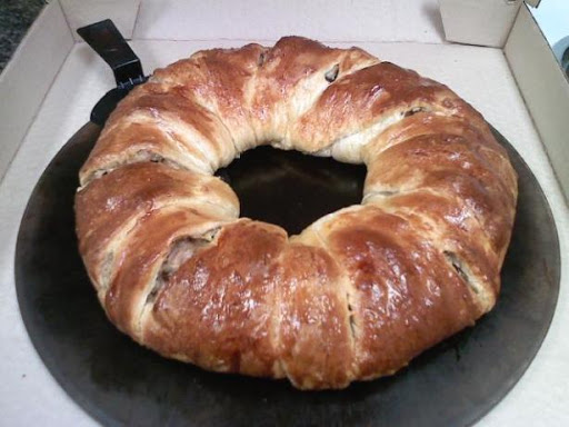 * Arrange 8 triangles in a circle on a large pizza stone with wide ends 3 inches from edge of baking stone and points towards the outside. (Points will extend off the edge of the baking stone. Arrange remaining 8 triangles in center of baking stone, matching wide ends with triangles already in place. (Points will overlap in center.)