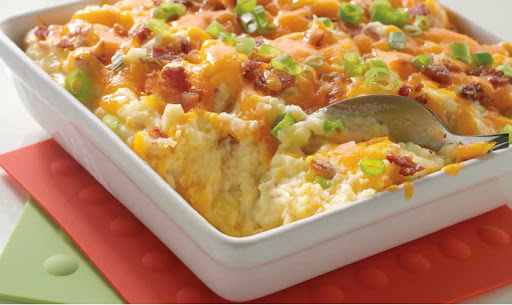 Serves 16. This casserole can be assembled ahead of time and refrigerated. Cover with foil and bake at 350° F for 40 to 45 minutes or until heated. Uncover; top with cheese, bacon and green onions; bake for an additional 3 minutes or until cheese is melted.