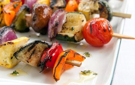 Alternate vegetables on skewers and place on ovenproof platter. Baste with barbecue sauce.